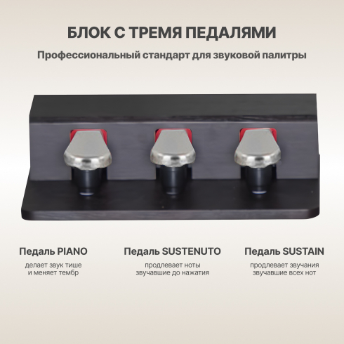 • В комплекте подставка с блоком из трёх педалей для большей выразительности при исполнении.