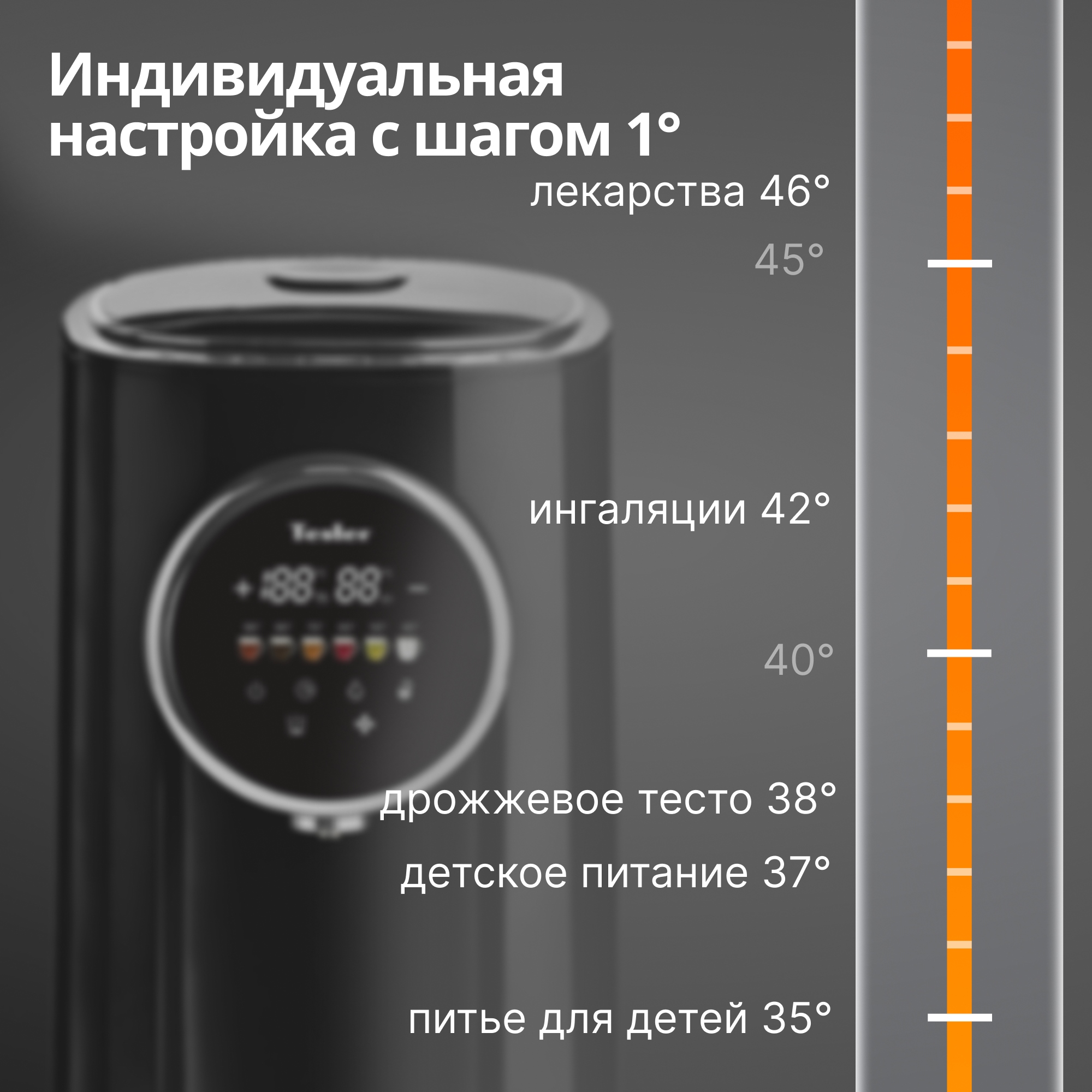 Термопот Tesler TP-5050 не только кипятит воду, но и позволяет нагревать её до одной из шести заранее установленных температур: от 45 °C до 95 °C. Устройство стабильно поддерживает выбранный температурный режим, что удобно для приготовления разных видов напитков - от зелёного чая до детских смесей.