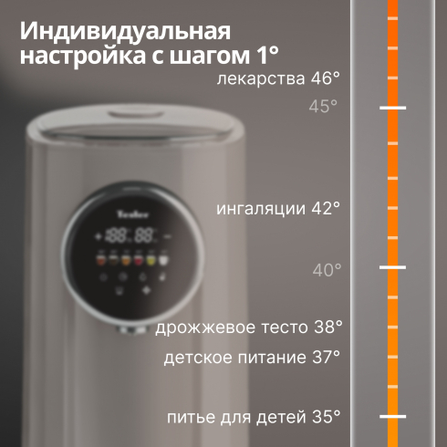 Термопот Tesler TP-5050 не только кипятит воду, но и позволяет нагревать её до одной из шести заранее установленных температур:  от 45 °C до 95 °C.  Устройство стабильно поддерживает выбранный температурный режим, что удобно для приготовления разных видов напитков - от зелёного чая до детских смесей.