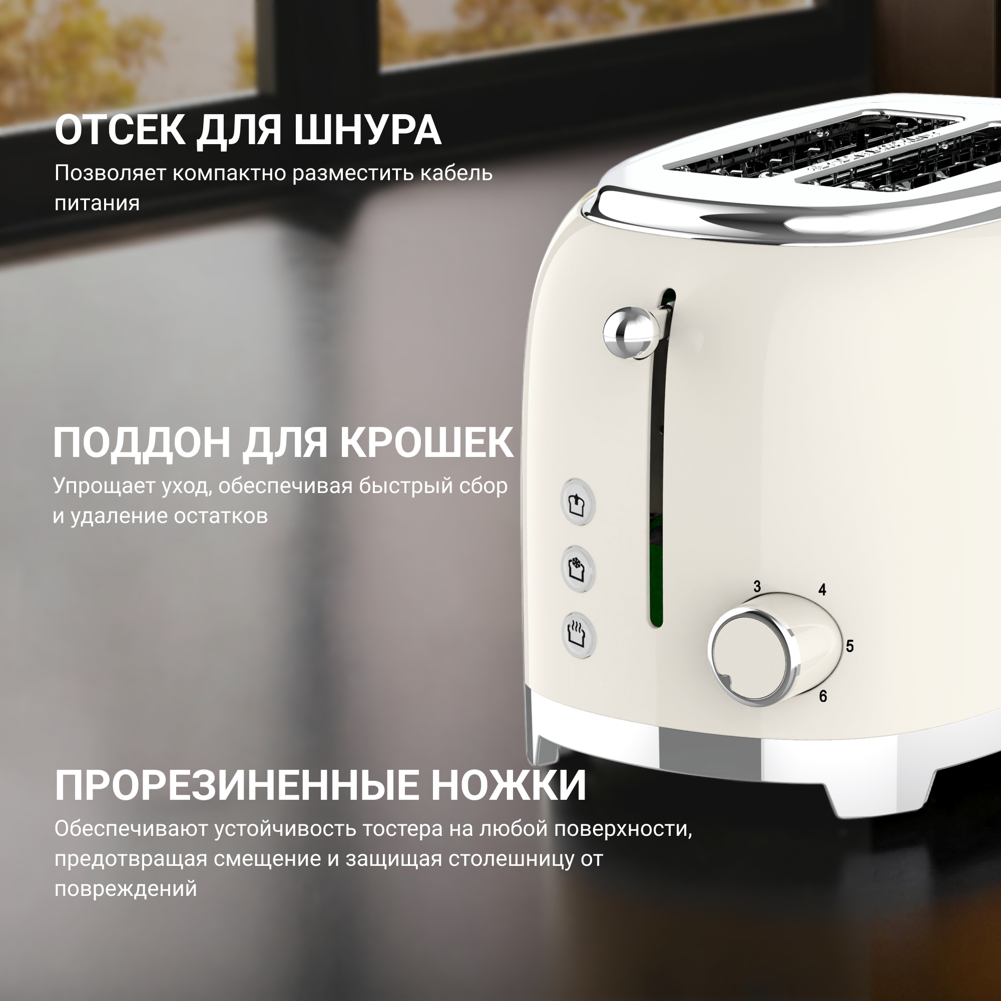 Удобен в повседневном использовании:  поддон для крошек упрощает уход, антискользящие резиновые ножки обеспечивают устойчивость на любой рабочей поверхности, а специальный отсек позволяет компактно разместить кабель питания.