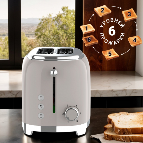 Шесть уровней прожарки позволяют точно настроить степень хрустящей корочки - от лёгкого золотистого оттенка до яркого румяного тоста.